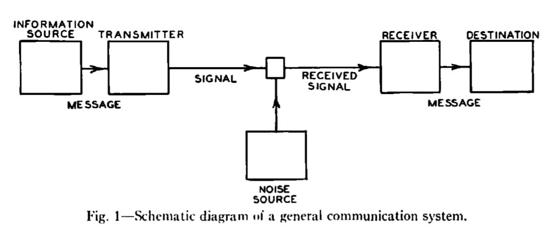 This schematic outlines how information is transferred across any system. It works with speech, with light, with sound. Anything that transfers information from one place to another. As Shannon puts it in his paper, this flowchart is a function of time and “other variables”. That’s what this is meant to be. The fundamental building blocks of how information moves over a channel over a period of time.