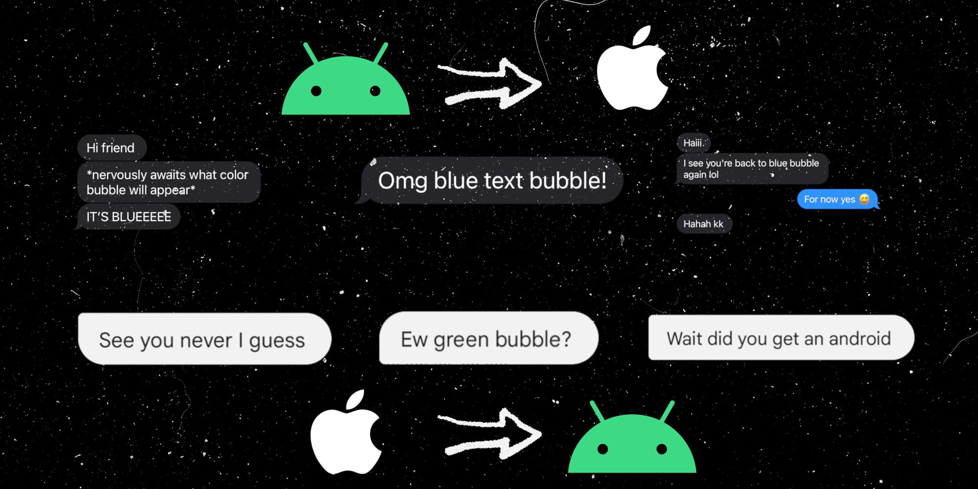 So I started paying closer attention. And I started to notice that every time I switch from an iPhone to an Android phone, I get messages such as “See you never I guess”, “Ew green bubble?” or “Wait did you get an Android”. And every time I switch back, I get messages like “Omg blue text bubble!” or “IT’S BLUEEEE”.