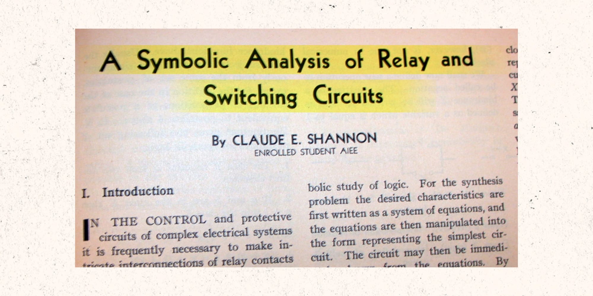 When the government recruited him, Shannon had just published his Master’s thesis, A Symbolic Analysis of Relay and Switching Circuits, which proved that boolean algebra, the use of a 1, meaning true, or a 0, meaning false, could be used to simplify effectively all telecommunications relays, and also use those relays to solve boolean algebra problems. Shannon effectively invented the modern digital circuit - the foundations for the hardware that runs most of the modern world. And he did this as a 22 year-old man.