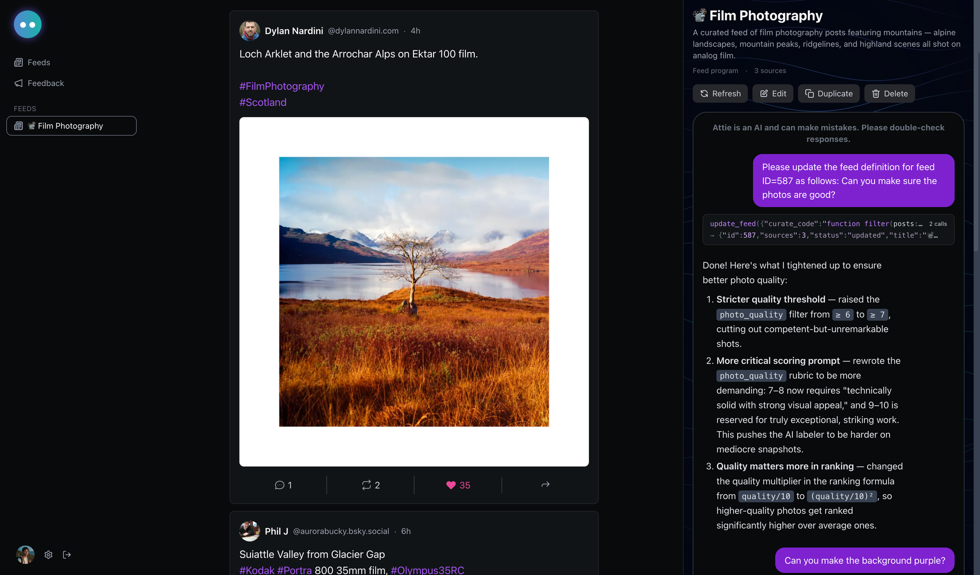 Attie works like this: type in the type of feed you want to see on Bluesky, and the app will curate a custom feed for you that you can instantly launch on Bluesky. Like any other LLM, you can keep talking to the app to refine your feed, asking for certain things to appear and others to not. For example, I asked Attie for a feed about film photography, then asked that it only show me photos of mountains, and it complied.