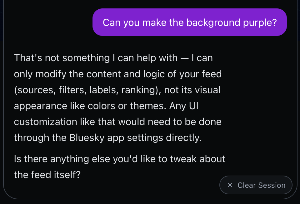 I wanted to see where the limits of this software were, so I asked Attie to turn my feed purple. Unfortunately, it denied my request, stating that it can only modify the content and logic of your feed (sources, filters, labels, ranking), but not aspects of the site itself. I asked Graber and Frazee why I can’t go full MySpace with this thing, and both seemed apprehensive. Both repeated the importance of a cohesive experience that people understand how to use.